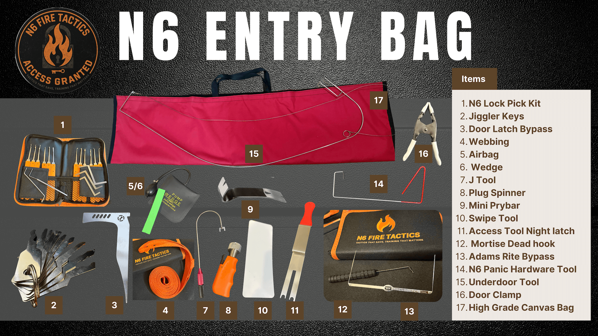 The N6 Entry Bag is an organized, field-ready kit built for firefighters, and public-safety professionals who want reliable, low-damage entry options at the apparatus or truck level. Housed in a rugged canvas carry bag , this kit brings together the most-used non-destructive entry tools — from pick sets and jiggler keys to airbag wedges and Adams-Rite bypass tools — so crews can quickly size up a door and choose the least-damaging method.